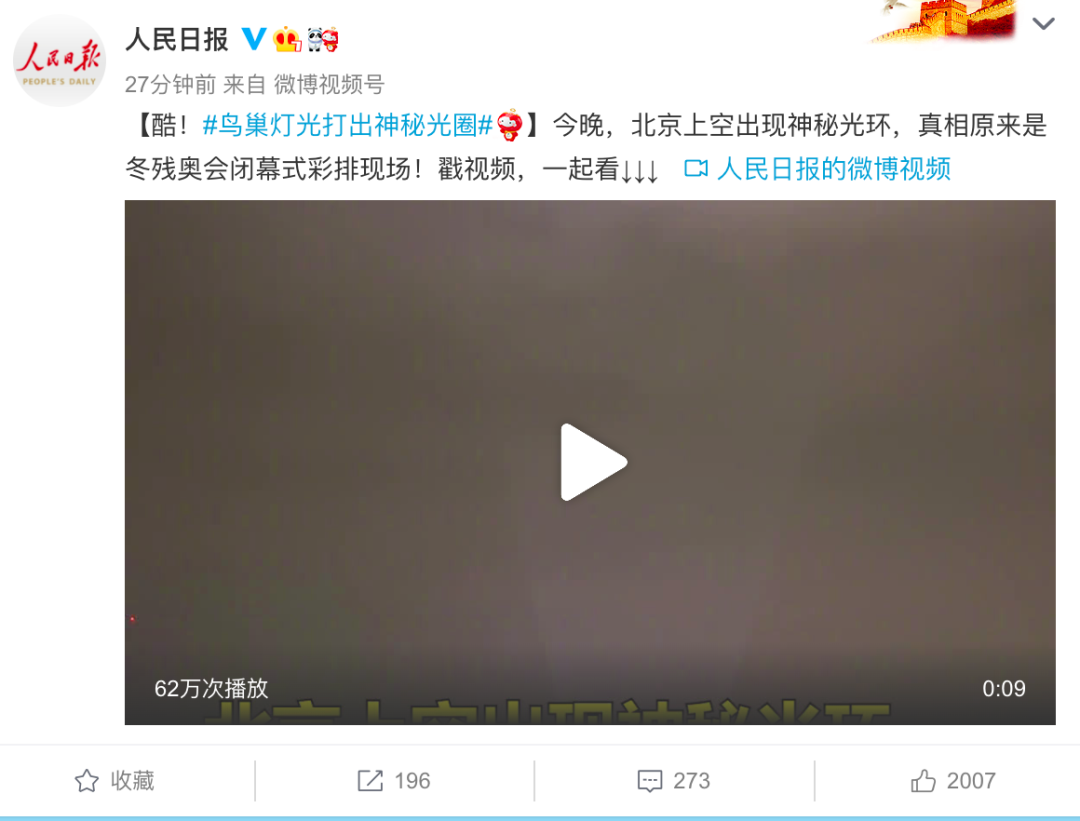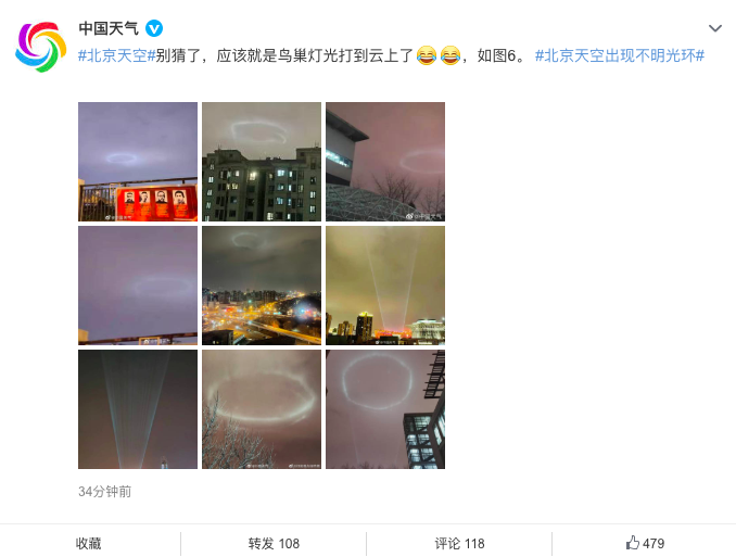 刚刚 @中国天气 回复:“别猜了,应该就是鸟巢灯光打到云上了。”还配上了多张鸟巢亮着灯的照片。