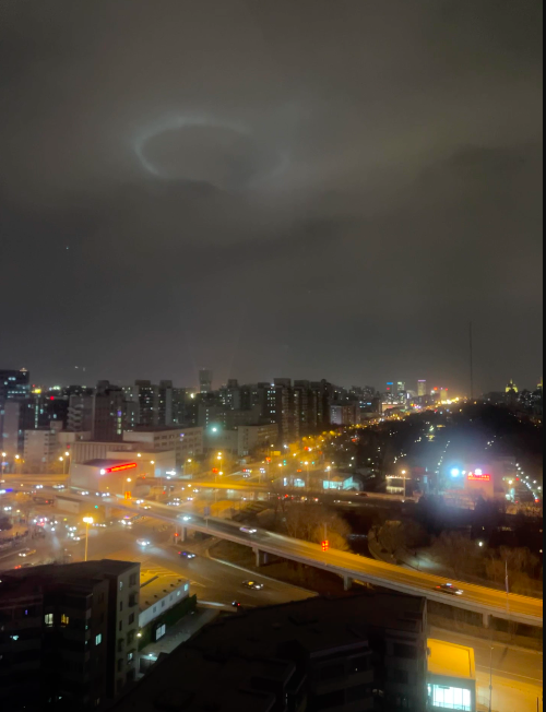 今晚,多位北京网友拍摄到北京天空出现一个明亮光圈的照片。