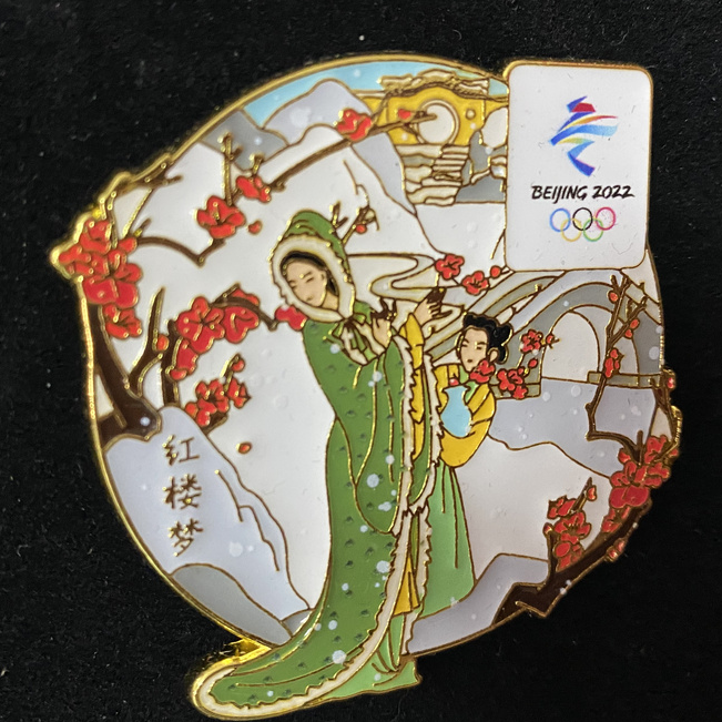 《红楼梦》第五十回《芦雪庵争联即景诗 暖香坞雅制春灯谜》中,宝琴身着绿色凫靥裘的经典场景,让徽章达人马烈印象深刻。他对记者说:“我看到冬奥特许厂商上新徽章目录中这套徽章的送审稿时,发现宝琴的凫靥裘的配色是红色的,与红楼梦原著不符,立刻与奥组委市场部说了一下。奥组委立即通知徽章设计师提出改进建议。最终,一套精美的忠于原著的四大名著徽章诞生,宝琴立雪,身着翠绿色凫靥裘的经典雪景呈现在大家面前。”