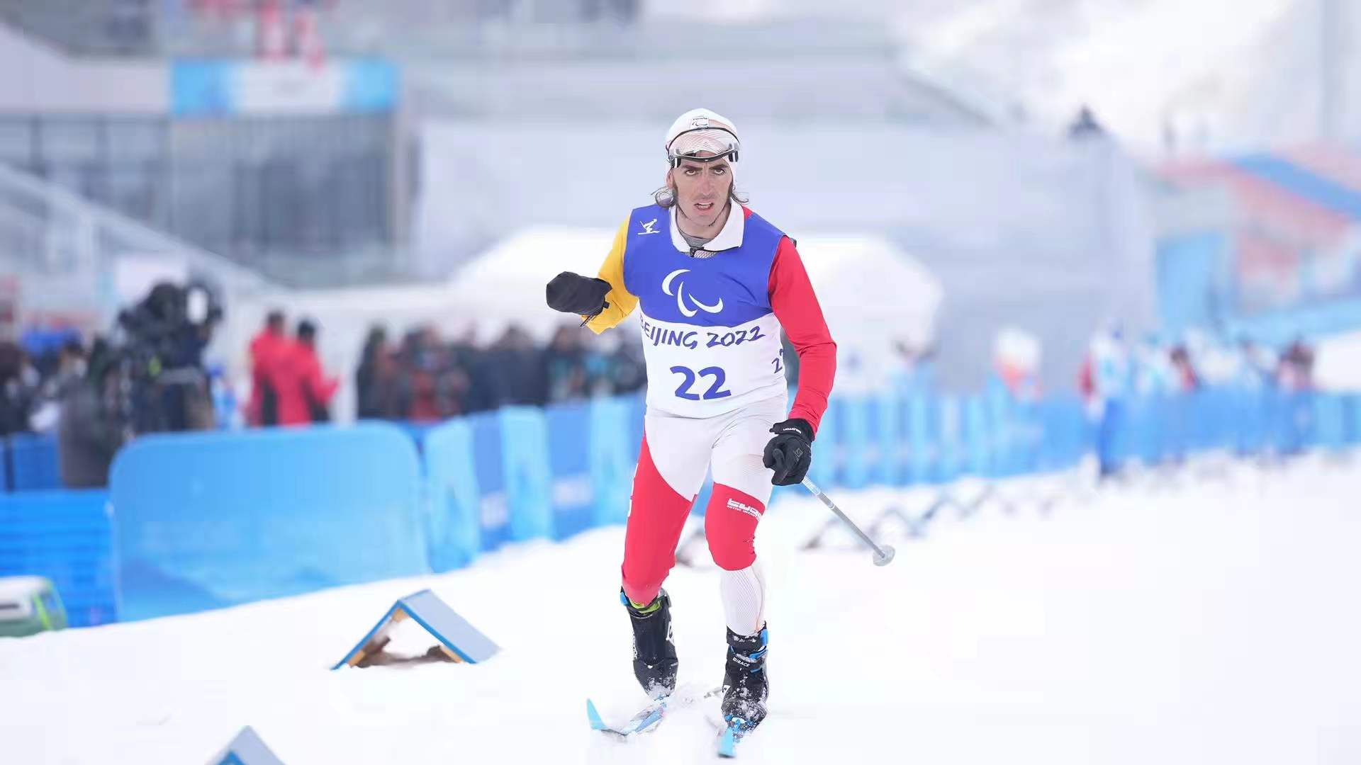 加西亚患有先天性的肌无力综合征,这让他比其他残疾人运动员更难。左手拄着雪杖,左脚迈步,右半身几乎是要被左半身拖着。他无法像其他运动员一样滑行,唯有沿着两条被踏出来的深深的雪印,以跑步的方式进行比赛。在点位旁站岗的志愿者说,“他几乎都是跑着过去的,可能只有在下坡的时候才会滑一下。但是他参加了很多项比赛,我经常能看到他。”