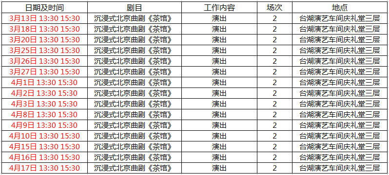 记者了解到,北京曲剧是北京唯一的地方戏,自1952年由老舍先生命名为“北京曲剧”,至今已有近70年历史。北京曲剧的表演没有传统戏曲的程式化,更加贴近生活,以演绎清代和近、现代北京题材为长。接下来,3至4月的周末,沉浸式北京曲剧《茶馆》将继续在台湖演艺车间上演,观众可通过微信公众号“台湖演艺车间”扫码购票。