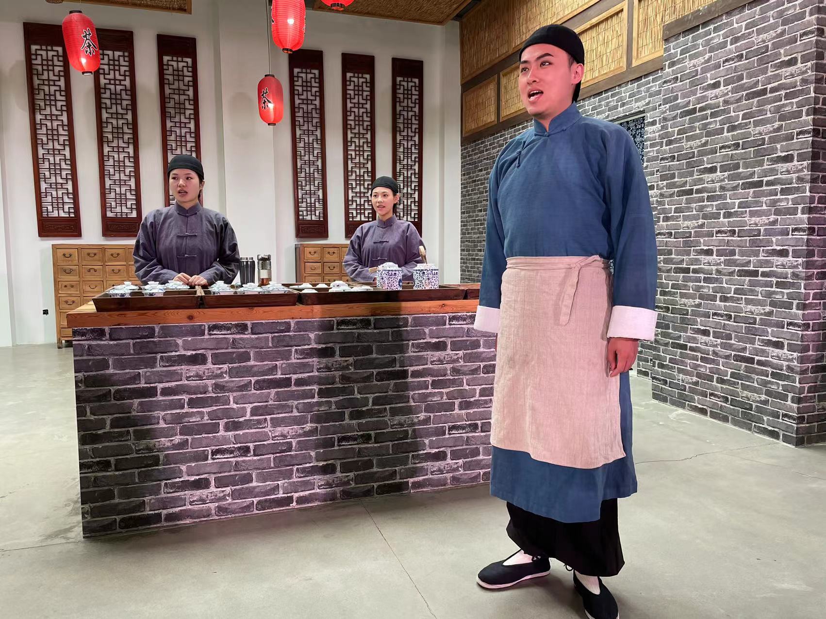 3月13日13时30分,随着茶馆伙计一声招呼,沉浸式北京曲剧《茶馆》正式在台湖演艺车间庆礼堂上演。舞台中间摆着几张八仙桌,观众就坐在桌边的长条凳上,演员悉数登场后,也坐在其中,点菜、喝茶、唱戏,一段段故事就在观众身边徐徐展开。