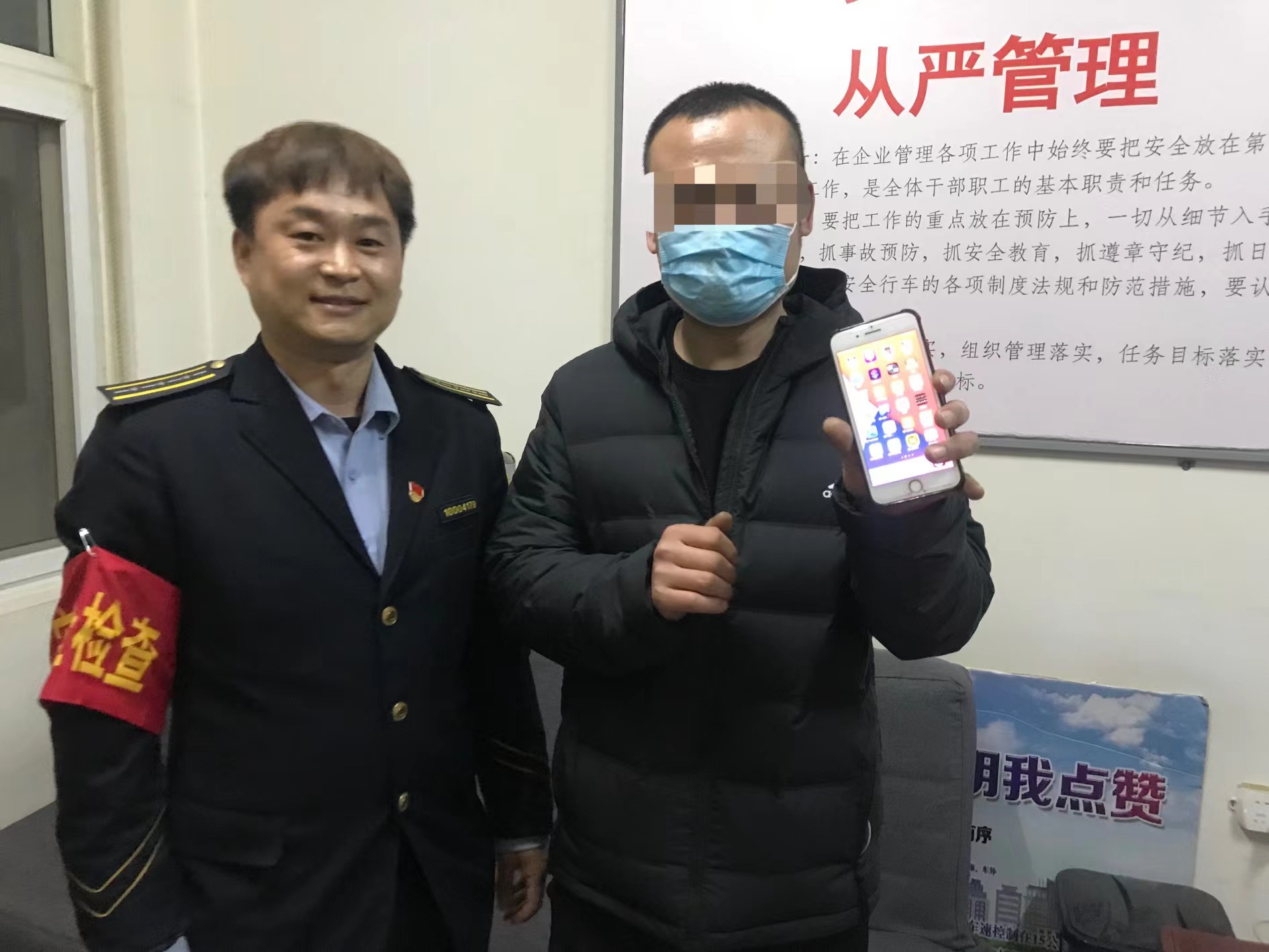回到场站后,苏师傅发现捡来的手机仅剩1%的电量,“如果手机关机了,失主联系不上,肯定特别着急!”他赶紧向安全员董春和借来充电器,给手机充上电,然后想办法找寻失主。好在手机壳的背面夹着一张出入证,上面有机主的姓名、身份证号和工作单位。两人正查找这家公司的联系电话时,手机突然响了,苏师傅赶忙接起来。
