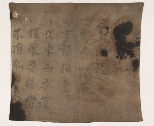 藏品:写有“六项注意”的包袱皮,系井冈山时期红四军一位战士用过的物品,纵85.7厘米,横94厘米,布质,上面有毛笔书写的文字。一般在行军时,战士们用它包裹衣物,宿营时挂起来可以作宣传。1959年5月江西省博物馆拨交中央革命博物馆筹备处(今中国国家博物馆)入藏。