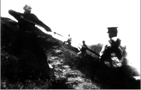 红军与敌人搏斗的场景。