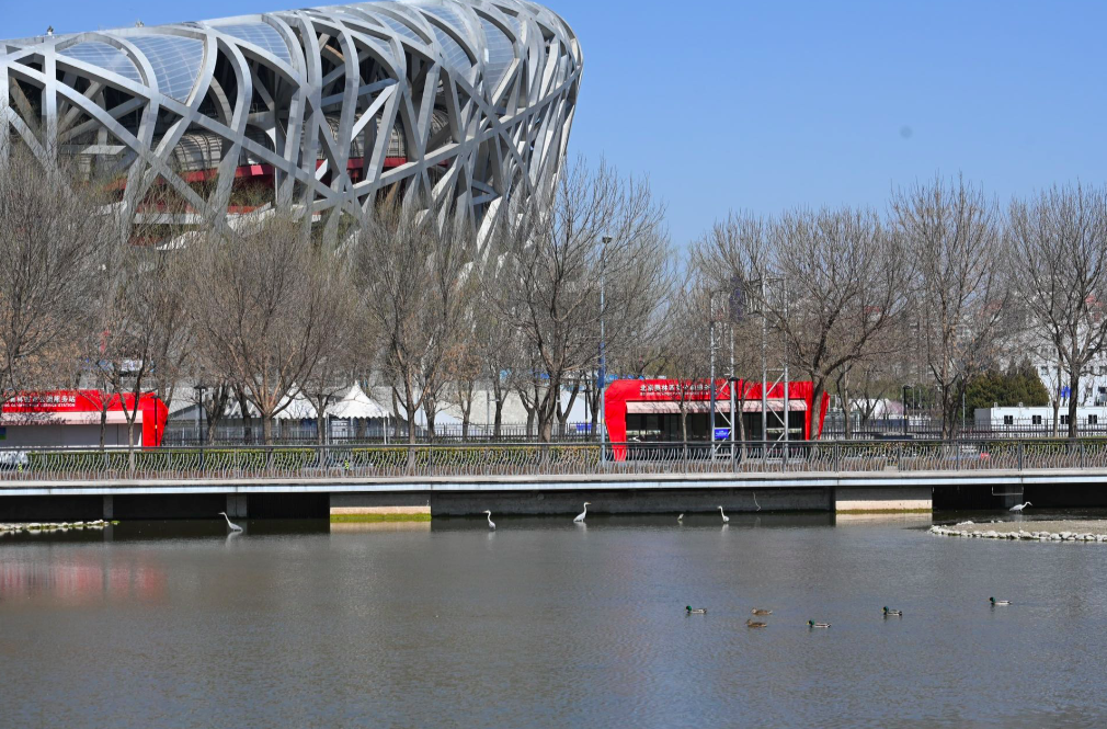 3月14日,北京冬奥会、冬残奥会结束后,奥森匹克公园中心区迎来新的春暖花开季,鸟巢被春花环抱,越来越多的飞禽来到鸟巢的水边嬉戏安居。