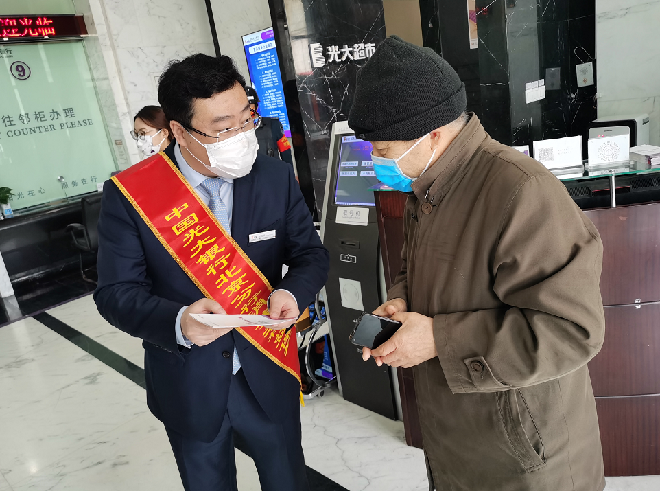 在客户等候区,王罡主动上前与客户交流关于光大银行产品和服务的体验,并邀请客户参与分行“网点厅堂融合”调研,特别是针对老年客户,他亲切地询问对分行线下网点适老化服务以及智能设备、手机银行等数字金融方面的意见建议。客户表示,起初不习惯使用手机银行,但光大银行推出“简爱版”手机银行后,通过员工不厌其烦地服务和讲解,现在已经能够熟练应用,特别感谢光大银行员工们给予老年人周到、热心和耐心的服务。客户对分行行长亲自当大堂经理,为客户提供服务非常欣喜,纷纷表示,“光大银行的服务越来越亲民,越来越贴心。”