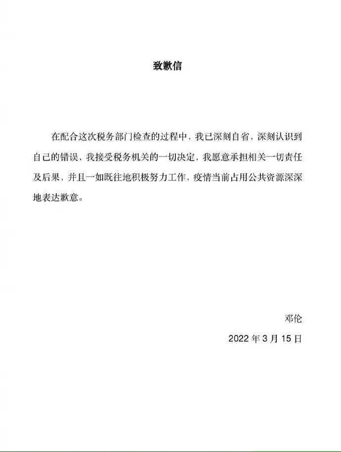 邓伦本人发致歉信,表示愿意承担一切责任后果,并且一如既往积极努力工作。