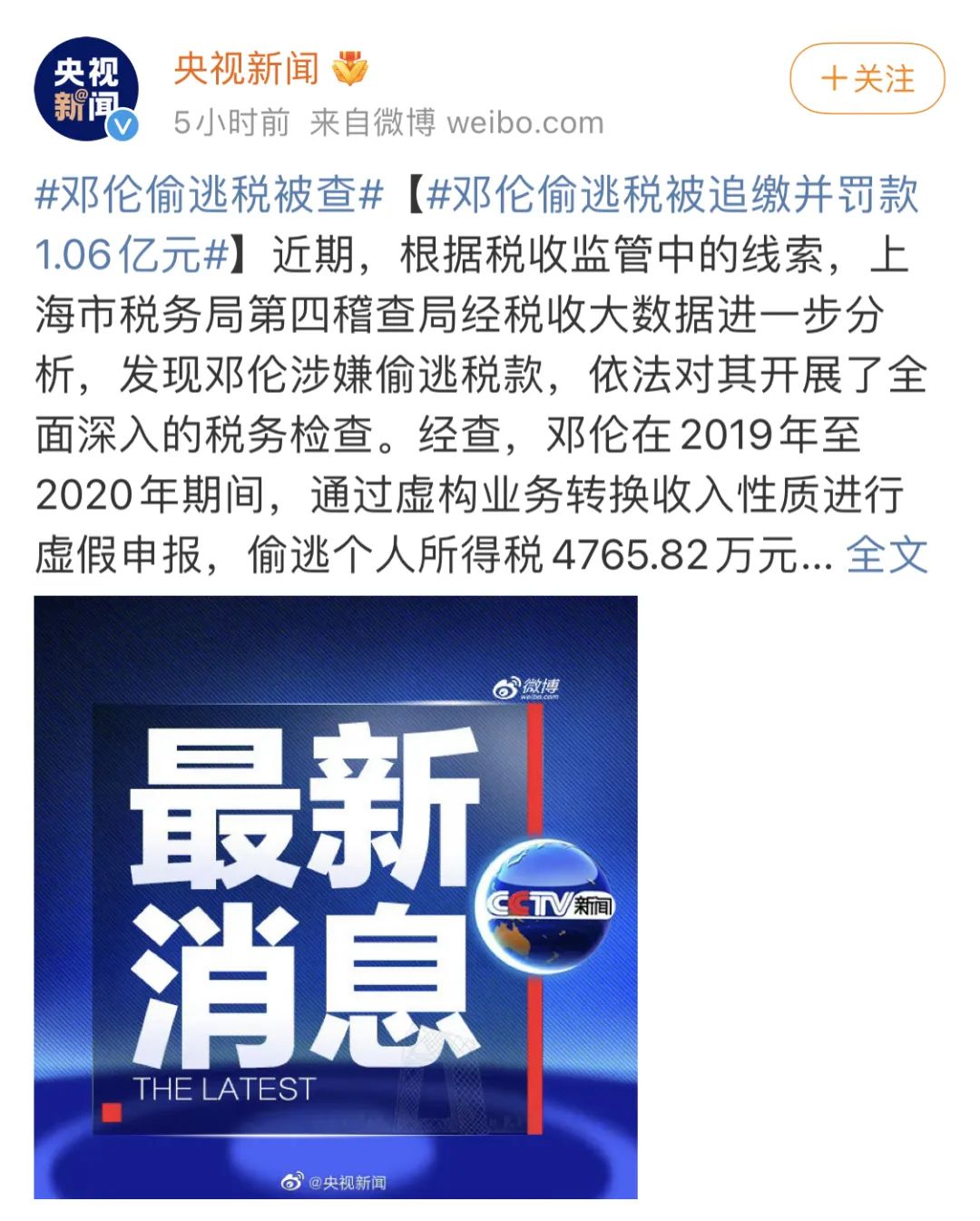 今天,央视新闻报道,演员邓伦因偷逃税被处罚并追缴1.06亿元。