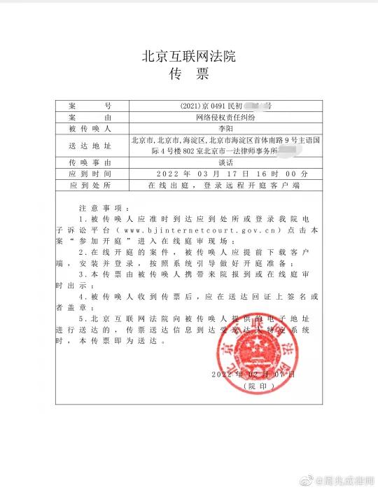 中新网从李阳代理律师周兆成处获悉,“疯狂英语”创始人李阳诉前妻网络侵权案,将于今天下午4点在北京互联网法院开庭。