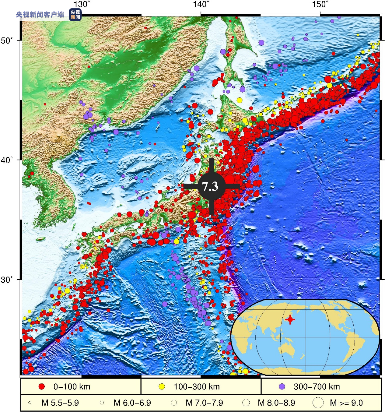 2022年3月16日22时36分(北京时间),日本本州东部海域(37.70°N,141.59°E)发生7.3级地震,震源深度为61.0千米。
