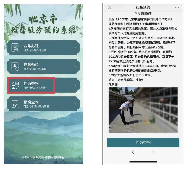 代为祭扫需要在网上提前预约,流程上与现场祭扫网上预约方法相同,均需要先关注“北京社会建设和民政”微信公众号,进入后再进行实名认证与登录,在“北京殡葬服务预约系统”首页点击“代为祭扫”按钮进行预约。
