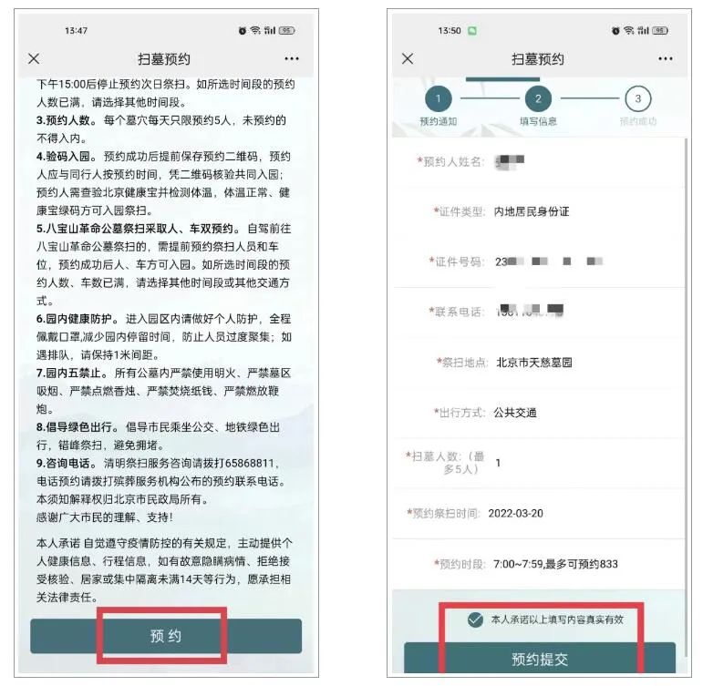 预约成功后提前保存预约二维码,预约人应与同行人按预约时间,凭二维码核验共同入园;预约人需查验北京健康宝并检测体温,体温正常、健康宝绿码方可入园祭扫。设立绿色便捷通道,保障老年人等特殊群体祭扫需求。