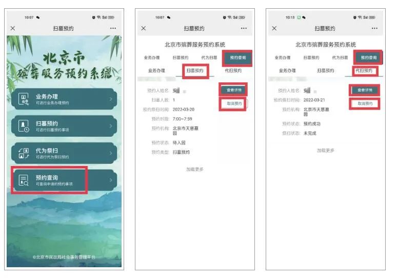预约后可通过“预约查询”功能,查看自己的“扫墓预约”或“代扫预约”信息,其中包括入园验证需要的二维码,如果预约时间无法前往或无需“代祭扫”,可通过“取消预约”进行取消。