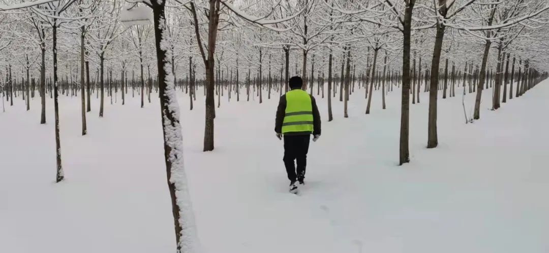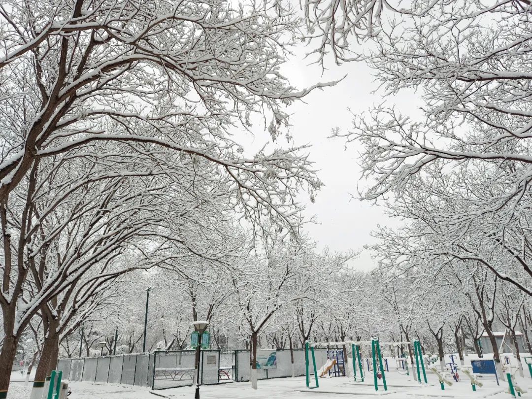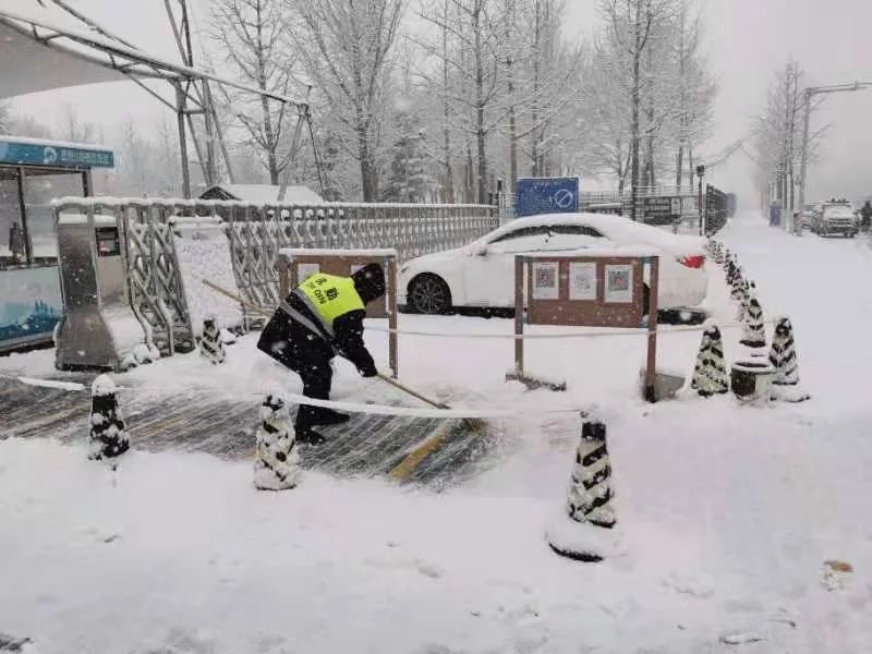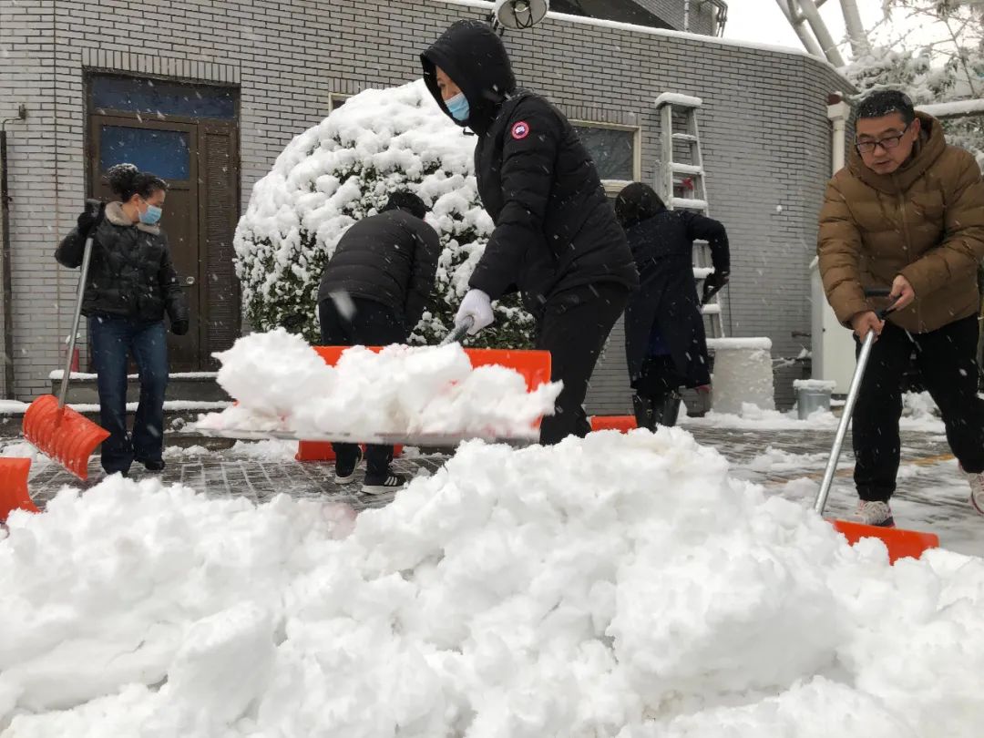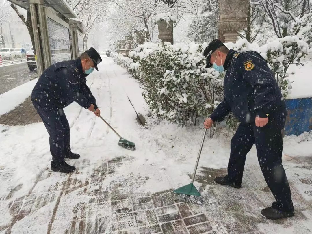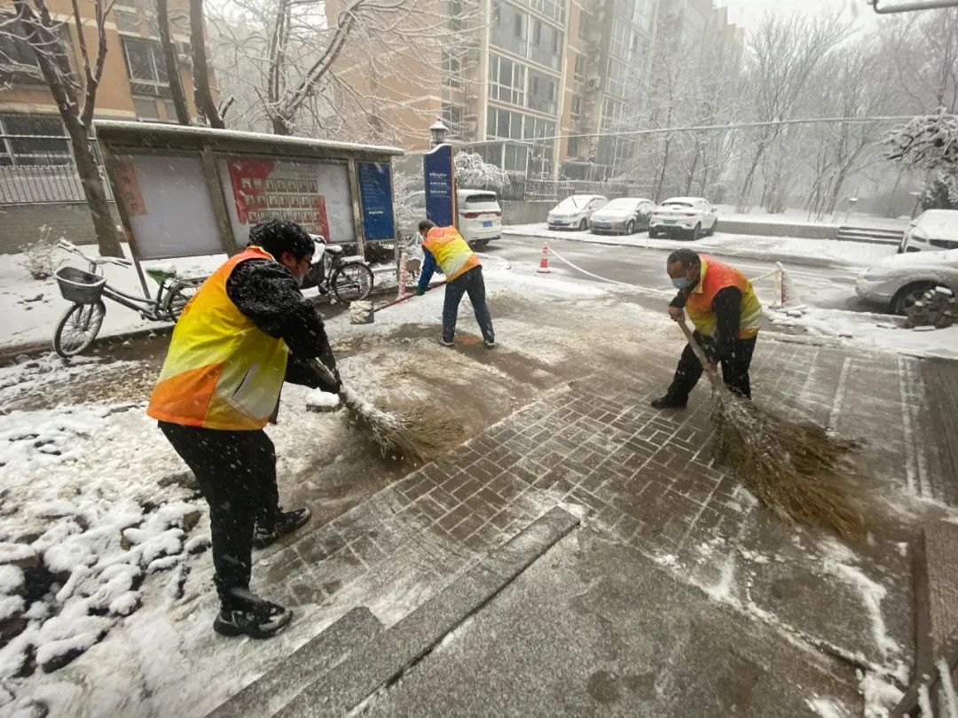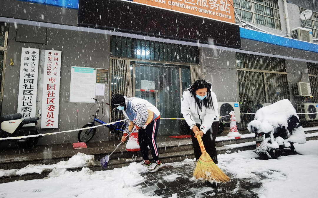 大兴各个公园工作人员在扫雪铲冰、清理路面积雪