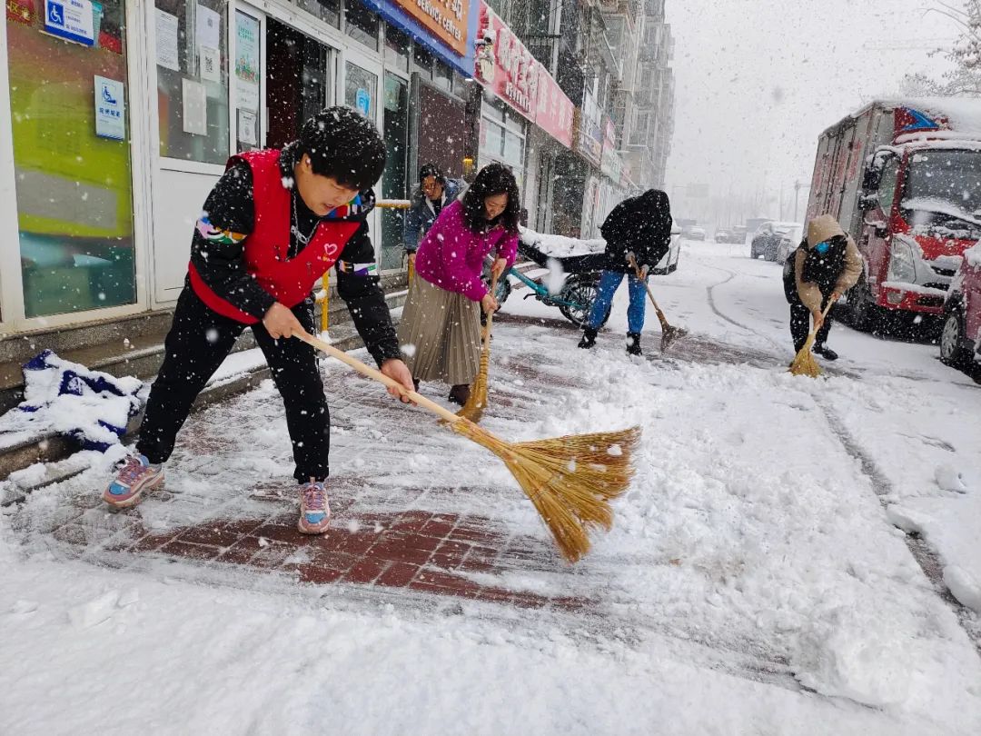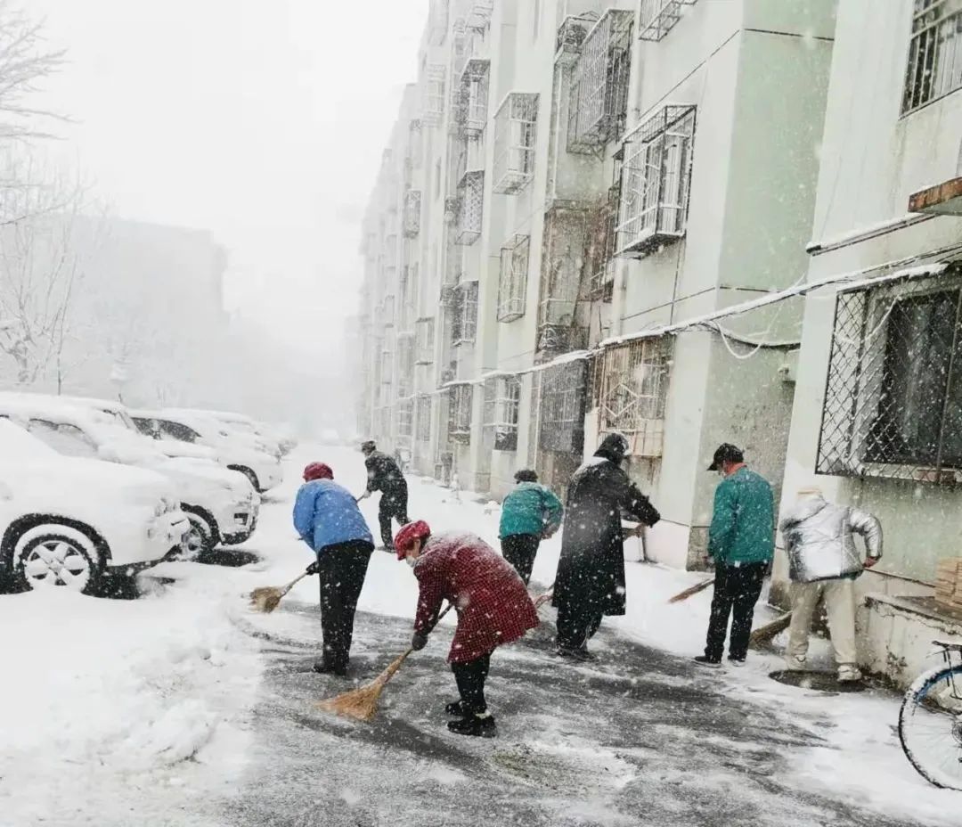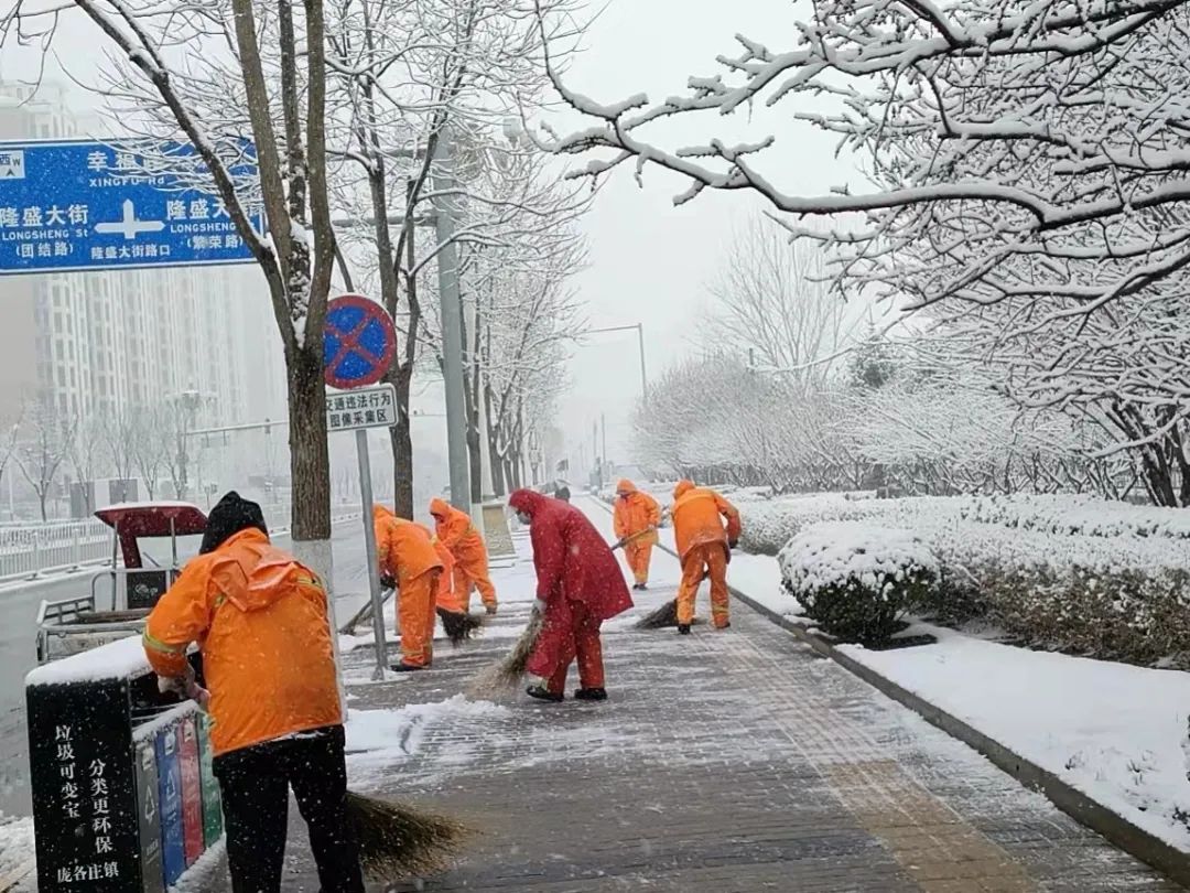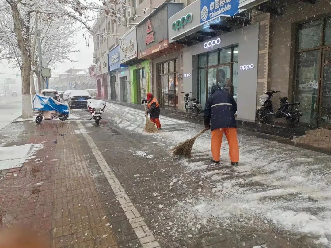 各个镇街、单位积极上街进行扫除铲冰