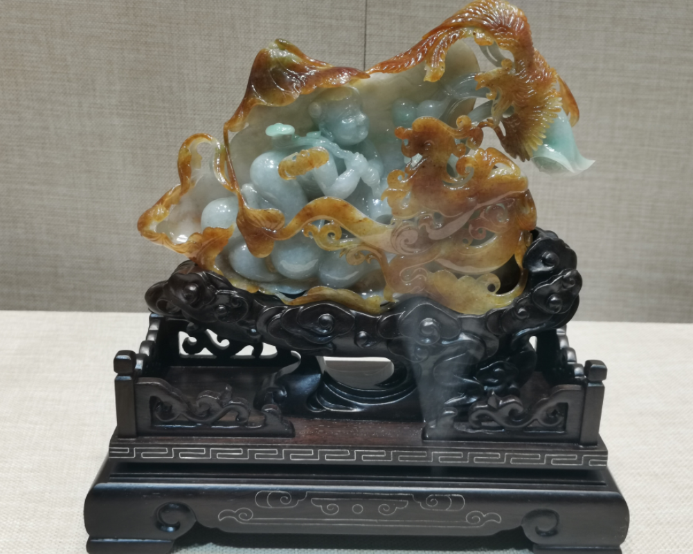 例如作品《敦煌印象》,灵感来源于敦煌石窟造像,整块玉料从中间一分为二,保留了原石的天然美。雕琢时巧妙利用翡翠内部颜色变化,将中间浅色部分雕刻成一对观音,似屹立于蜿蜒的山壁洞窟之中。观音周围的黄色部分,利用俏色巧雕飞天舞女,手持琵琶、翩翩起舞,体态轻盈,婀娜多姿。