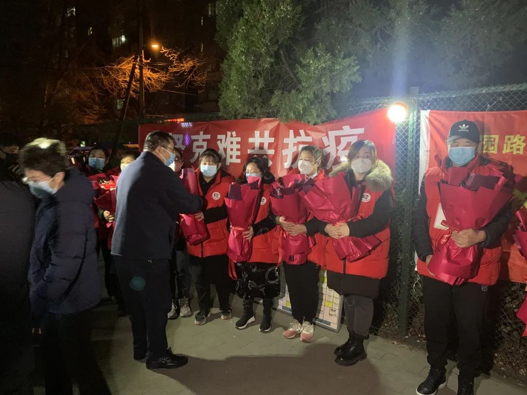 街道党工委书记高毅向塔院四园社区党委书记李冠英授“花园路街道优秀抗疫团队”牌匾。同时,街道工作人员将一束束鲜花送到社区工作者和医护工作者的手里,感谢这些“战疫”中“可爱的人们”。
