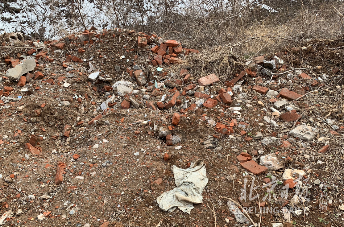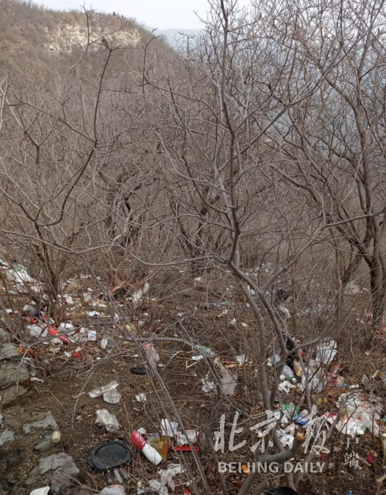 有一家三口脚踏登山鞋,手提登山杖,正从附近山上绕过铁栅栏,穿过树林中拉起的铁丝网,继续爬山。“我们家孩子刚七岁。”张先生说,他也是从社交平台上看见大家都这里来打卡,自己还是第一次来。山路上,尚未完全融化的雪被登山者踏出了数行脚印,不同于周围泥地和雪地的松软,脚印下的路已经凝结成冰。随着山势渐渐爬升,山上已经完全没有清晰的路,陡峭的山石和灌木丛充斥了视野,后来者仅能依据前行的登山者踩断和掰断的树枝判断道路。沿山石向上攀爬,每一步都要将腿抬到90度才能找到着力点。即使如此陡峭,在山石之间仍然可见各种塑料垃圾,矿泉水瓶、一次性筷子的塑料包装袋时有出现。在山路旁有两块高地,面积约30平方米,地面上分布着各种碎砖块和碎布条。