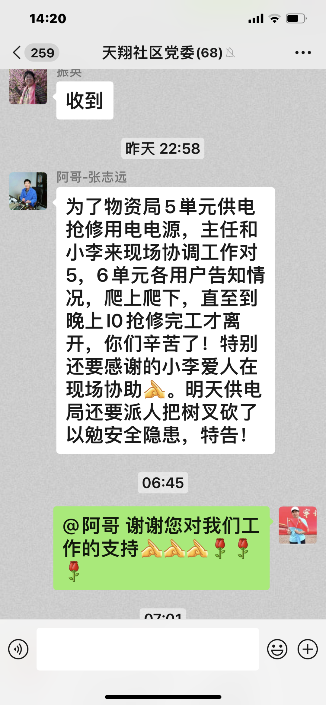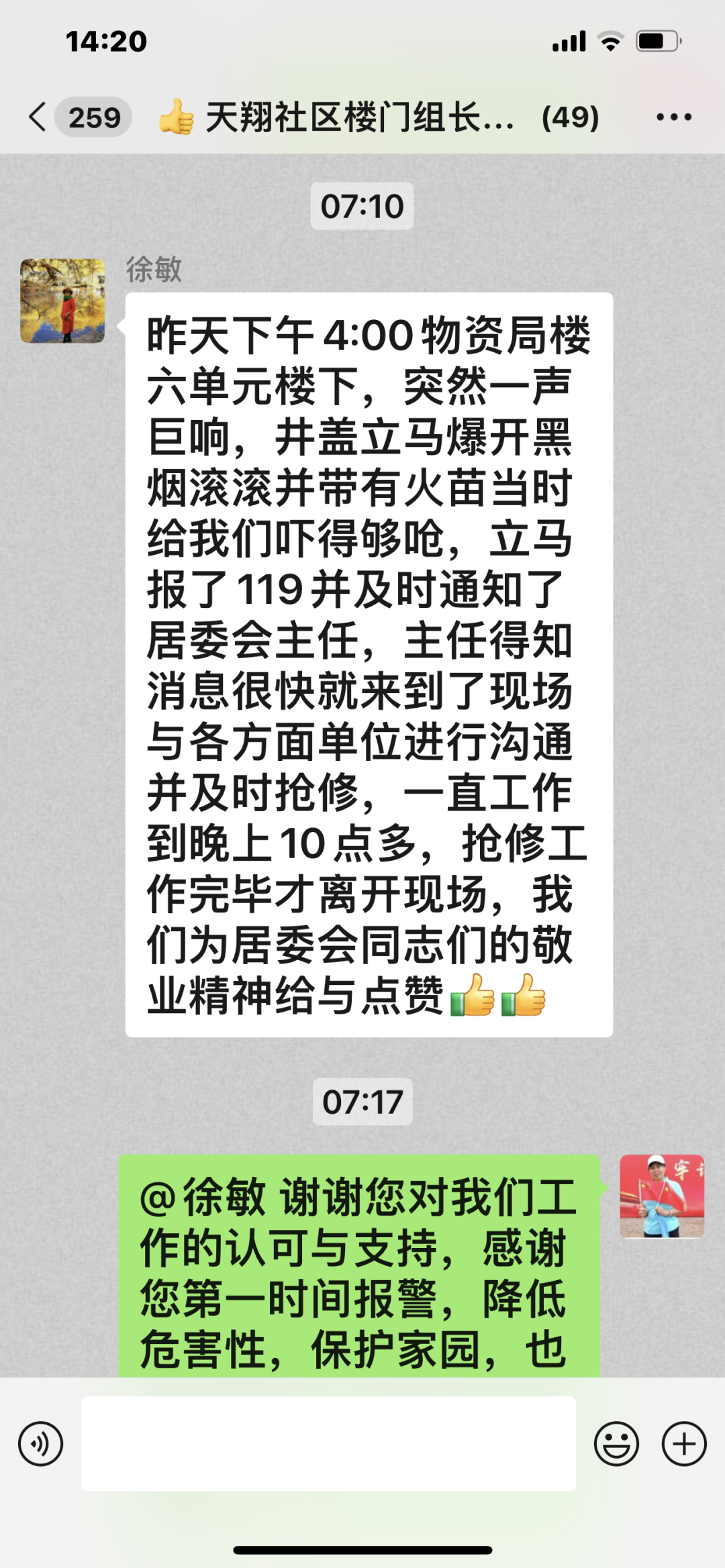 社区书记朱法萍立刻带领社区工作人员,挨家挨户解释停电原因和相关情况,社区包楼干部也第一时间在微信群中,告诉大家状况和处理进度。