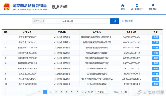 查询国家药监局网站,小儿止咳化痰制剂共有69个批文,包括小儿化痰止咳糖浆(7个)、颗粒(61个)、冲剂(1个)等三种剂型,涉及葵花药业集团重庆小葵花儿童制药有限公司、广西梧州三鹤药业股份有限公司、太极集团四川南充制药有限公司、国药集团同济堂(贵州)制药有限公司、华润三九(唐山)药业有限公司等多家药企。