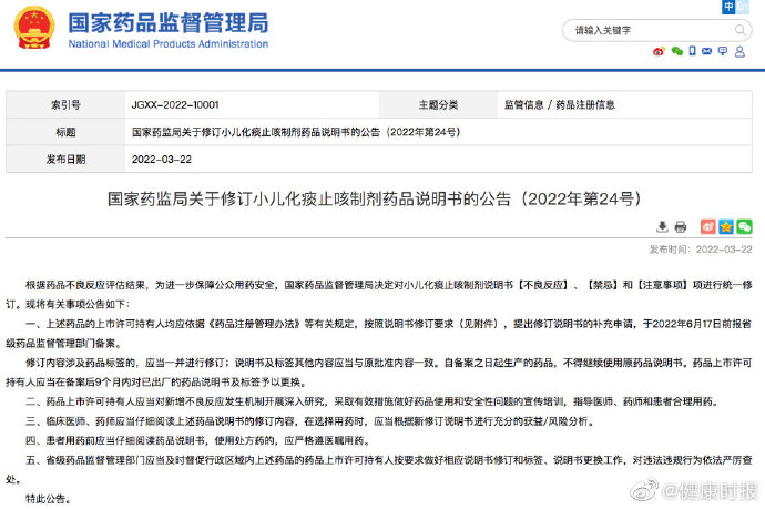 孩子咳嗽常用的小儿化痰止咳制剂说明书要修改了。3月22日,国家药监局网站发文表示,决定对小儿化痰止咳制剂说明书【不良反应】【禁忌】和【注意事项】项进行统一修订。
