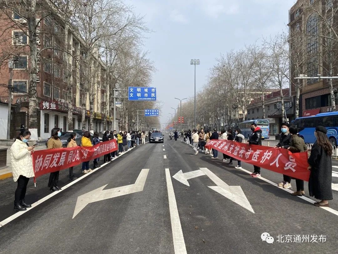 “感谢你们为三河抗击疫情做出的贡献!”“等待疫情散去,春暖花开,我们再相约!”三河市民站在道路两侧,手持横幅,向通州医务人员致谢。