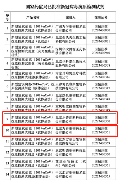 近日,国家药监局发布通告,14家企业新冠病毒抗原自测产品获批上市,其中,昌平2家企业北京万泰生物药业股份有限公司、北京乐普诊断科技股份有限公司获得国家药监局注册批准。