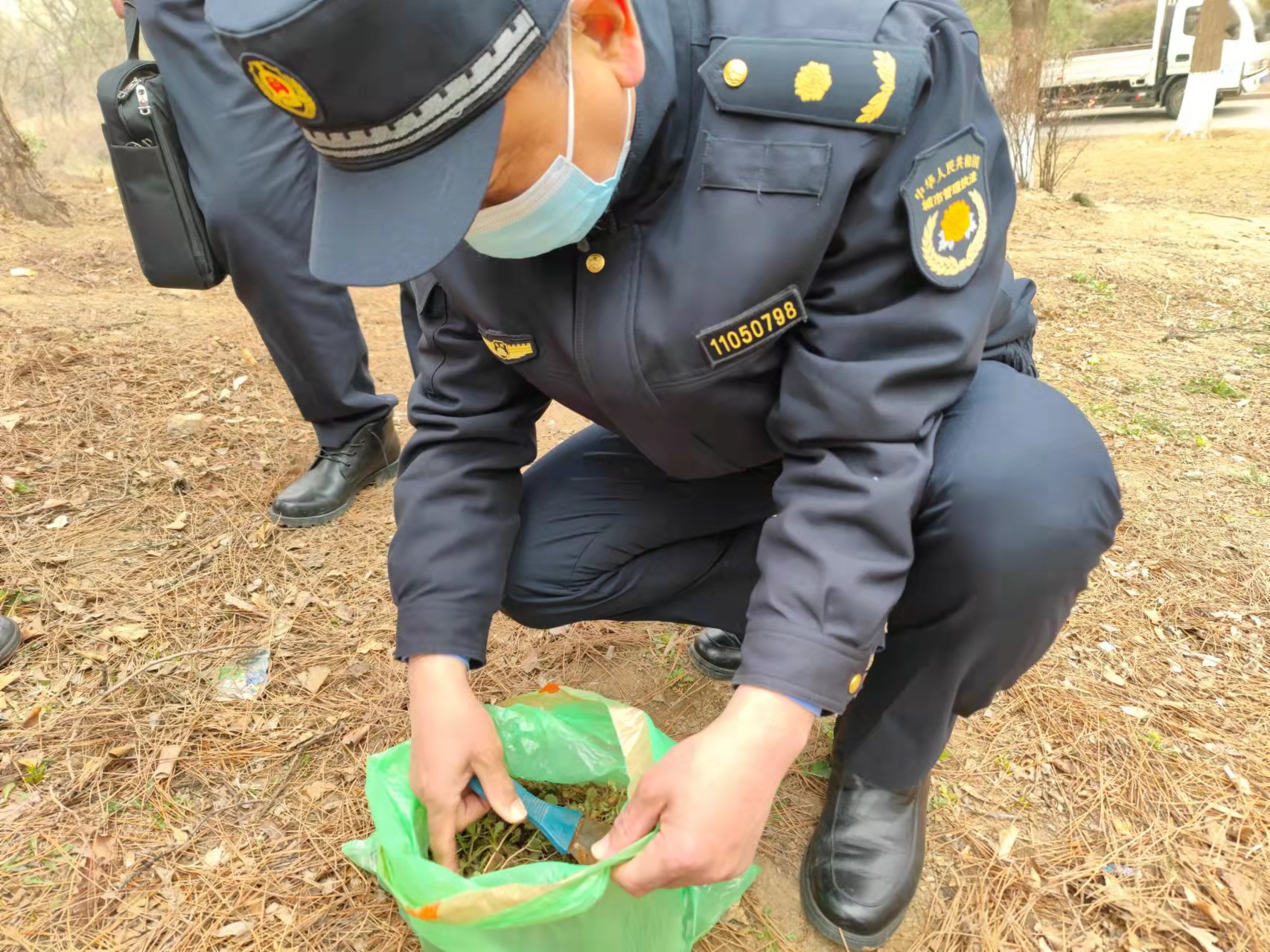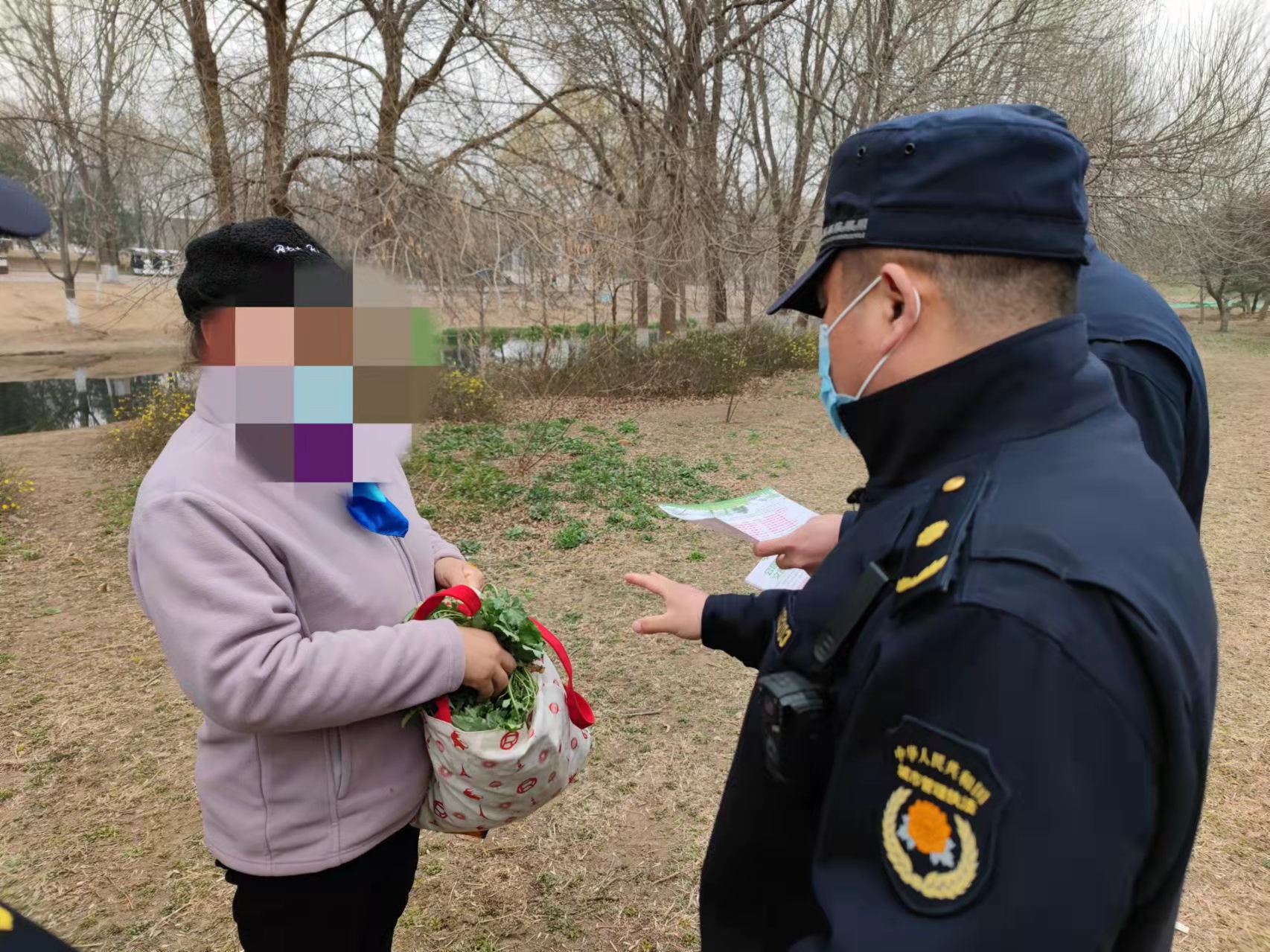 在园区的北侧草地内,有两位游客蹲在地上采挖野菜,执法人员立即进行了制止。面对执法人员的询问,游客解释称挖野菜是为了回去泡水喝,也是第一次来挖。因两人采挖野菜的行为属初次违法,且违法行为轻微并及时改正,没有造成危害后果,执法人员对其进行了口头警告和批评教育。