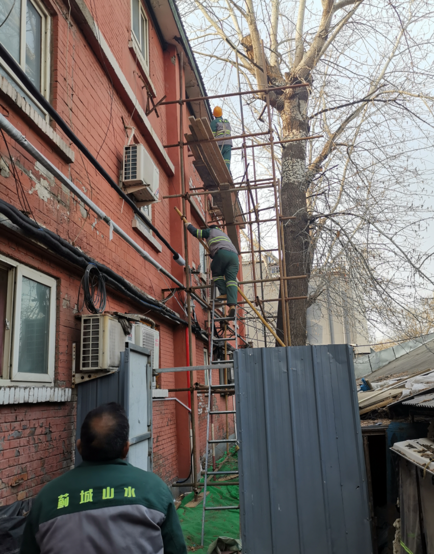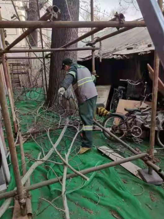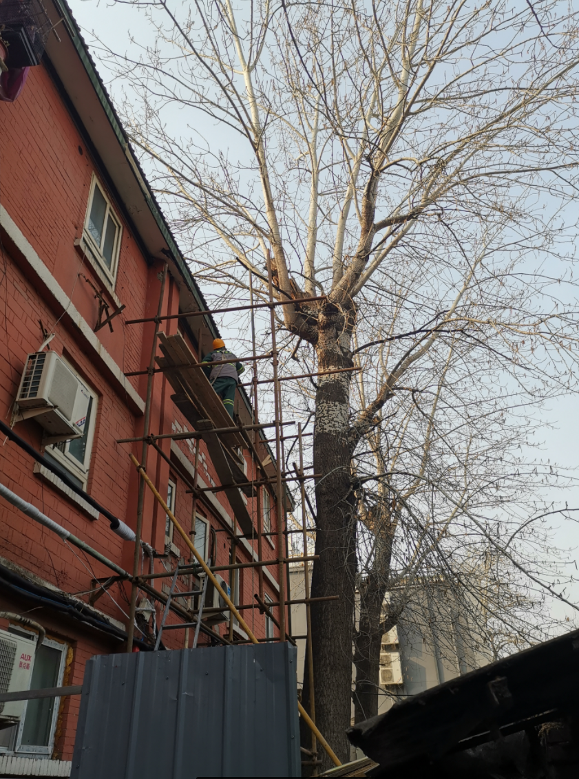 街道工作人员现场勘查后,将情况上报了绿化养护部门,由专业人员为树枝“整形”,可现场情形却让大家直皱眉:古先生家所在的三层小楼属于腾退区域,已经建了六七十年了,屋顶的瓦片由于年头久远已经发脆,工人无法站在屋顶作业。接着,工作人员又考虑能不能用吊车将工人送上去,可楼前的距离只有两三米宽,根本没有大型车辆的“施展”空间。最后,工人们选择了最“原始”的方式:搭起临时脚手架,“手动”修剪树枝。相较于前两种方式,工作量和工作难度都大了不少。
