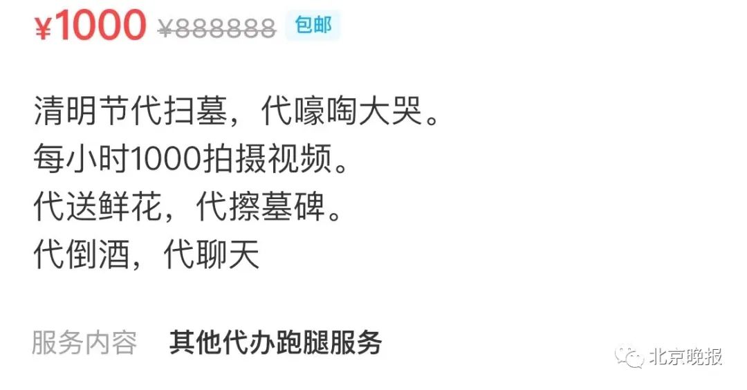 记者看到,各地私人代扫服务的价格相差悬殊,内容也五花八门。例如某承接苏州地区代扫服务的卖家介绍,自己的服务一次收费500元。需要鲜花另加100元,需要水果或糕点再加100元。磕头另外加钱,如需现场打开视频直播请扫墓者面对亲人倾诉,则要加收200元。另一称可“代倒酒、代聊天、代嚎啕大哭”的卖家,开价高达1000元。