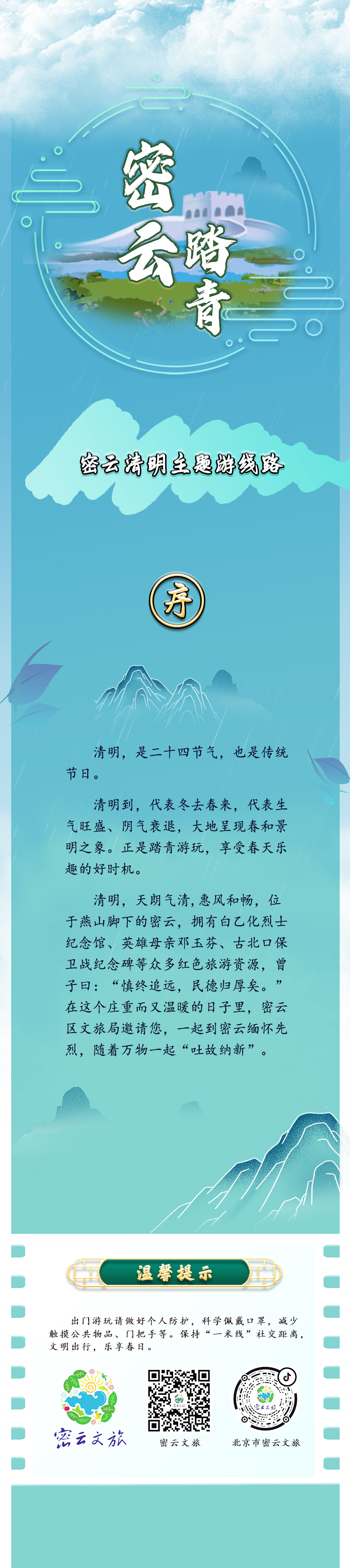 清明节假期即将到来,密云区文旅局推出10条清明踏青主题游线路,邀请市民到密云缅怀先烈、踏青迎春。