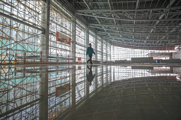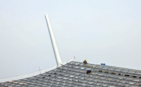 走进施工现场,工人们正站在高高的曲臂车上给博物馆外立面的玻璃进行固定和封边。他们身后是六根高耸的梭形柱,如巨轮桅杆一般撑起“风帆”造型的庞大屋顶。