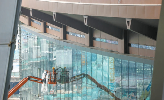 首都博物馆(东馆)玻璃立面似流水般波光粼粼,工人站在高高的曲臂车上进行固定和封边。