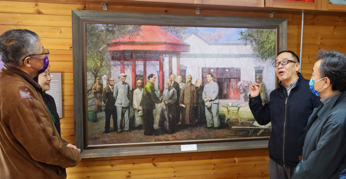 仪式现场,张峻明先生谈到画作的创作过程:“我多次实地来到双清别墅,细致的观察这里的建筑,观看展厅里的历史照片,感受着、理解着当时毛主席在香山接见民主人士,为筹建新中国与他们共商国是的场景和心情。这里的讲解员也给我很多帮助,一些画面中的细节,比如毛主席用自己的藤椅改造‘竹轿’用来抬年事较高的爱国华侨司徒美堂上山,在聆听讲解员介绍后我也把这把‘竹轿’画了进去。”