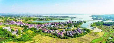江西省共青城市苏家垱乡,在湖光山色的映衬下,民居和农田错落有致、相映成趣。 王富忱摄/光明图片