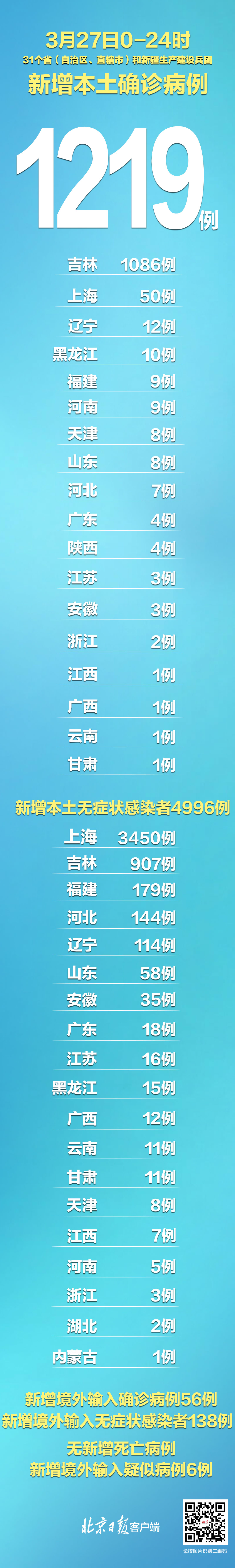 3月27日0—24时,31个省(自治区、直辖市)和新疆生产建设兵团报告新增确诊病例1275例。其中境外输入病例56例(广西14例,四川12例,上海10例,广东6例,吉林4例,浙江3例,福建3例,北京2例,黑龙江1例,河南1例),含15例由无症状感染者转为确诊病例(四川10例,浙江3例,河南1例,广东1例);本土病例1219例,含217例由无症状感染者转为确诊病例(吉林201例,福建4例,陕西4例,山东3例,天津2例,浙江2例,辽宁1例)。无新增死亡病例。新增疑似病例6例,均为境外输入病例(均在上海)。