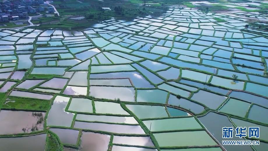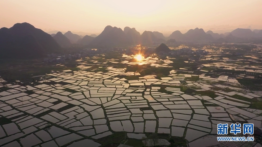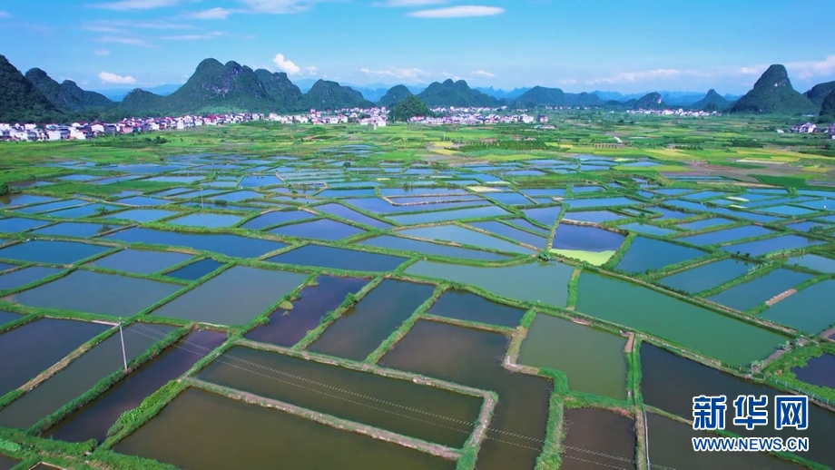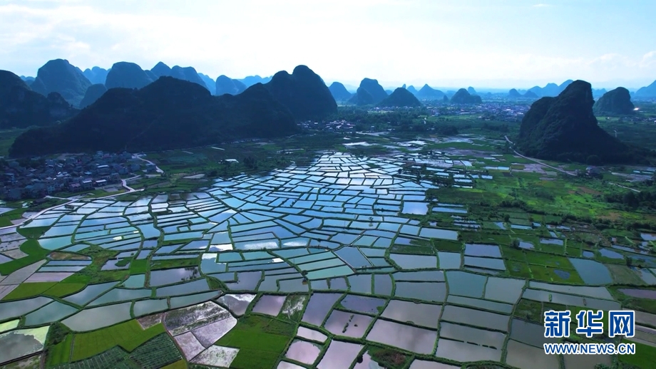 在广西桂林市临桂区会仙镇沐宦头村,春耕时节的农田灌满了水,宛如一片片镜子,镶嵌于群山怀抱之中,倒映着蓝天、白云、山峰、村庄,山水相连、天地一体,构成了一幅美丽的山水田园画卷,成为众多游客和摄影爱好者向往的网红打卡点。
