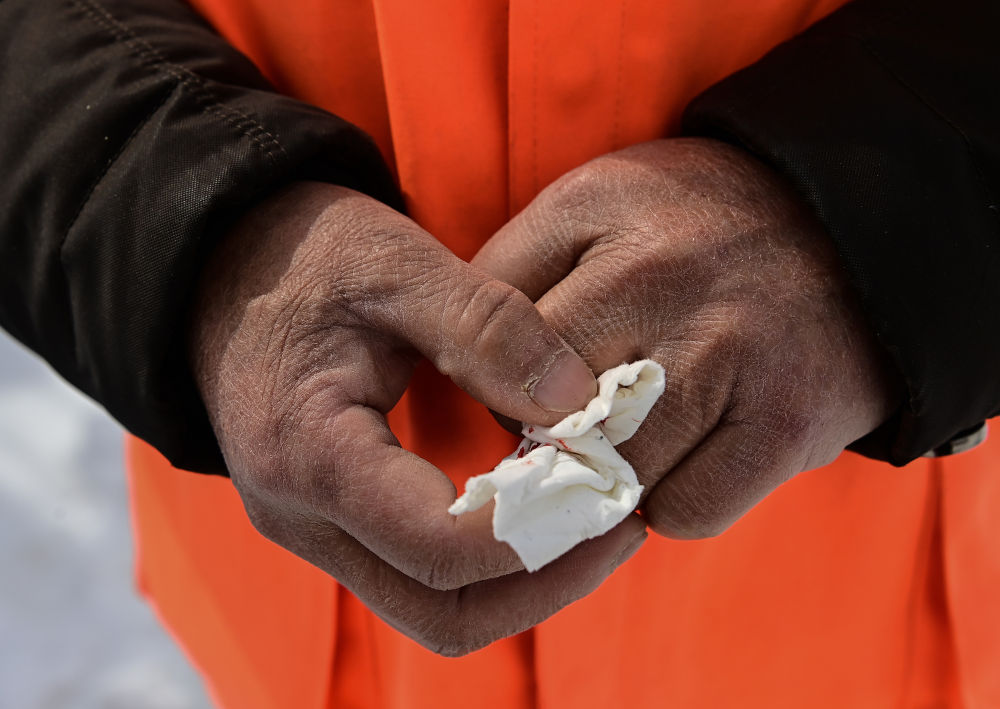 3月19日,宋臣在瞭望塔外的院子中清理积雪时不慎被雪铲割伤手指。