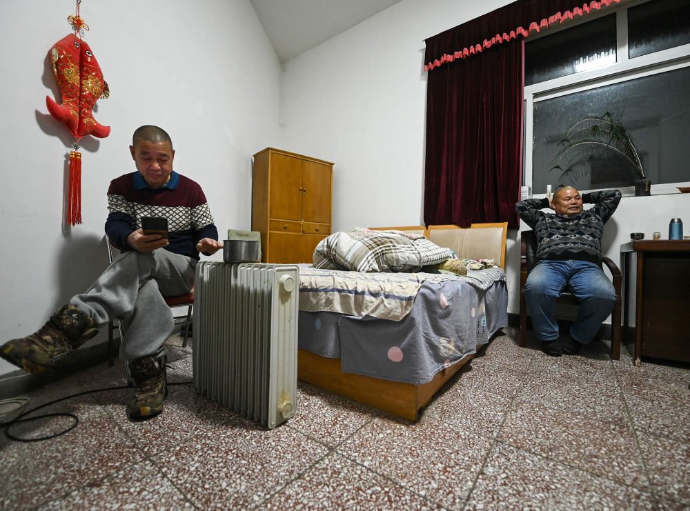 3月18日,在瞭望塔内宿舍休息的宋臣(左)在看手机,一旁的宋宝在看电视。
