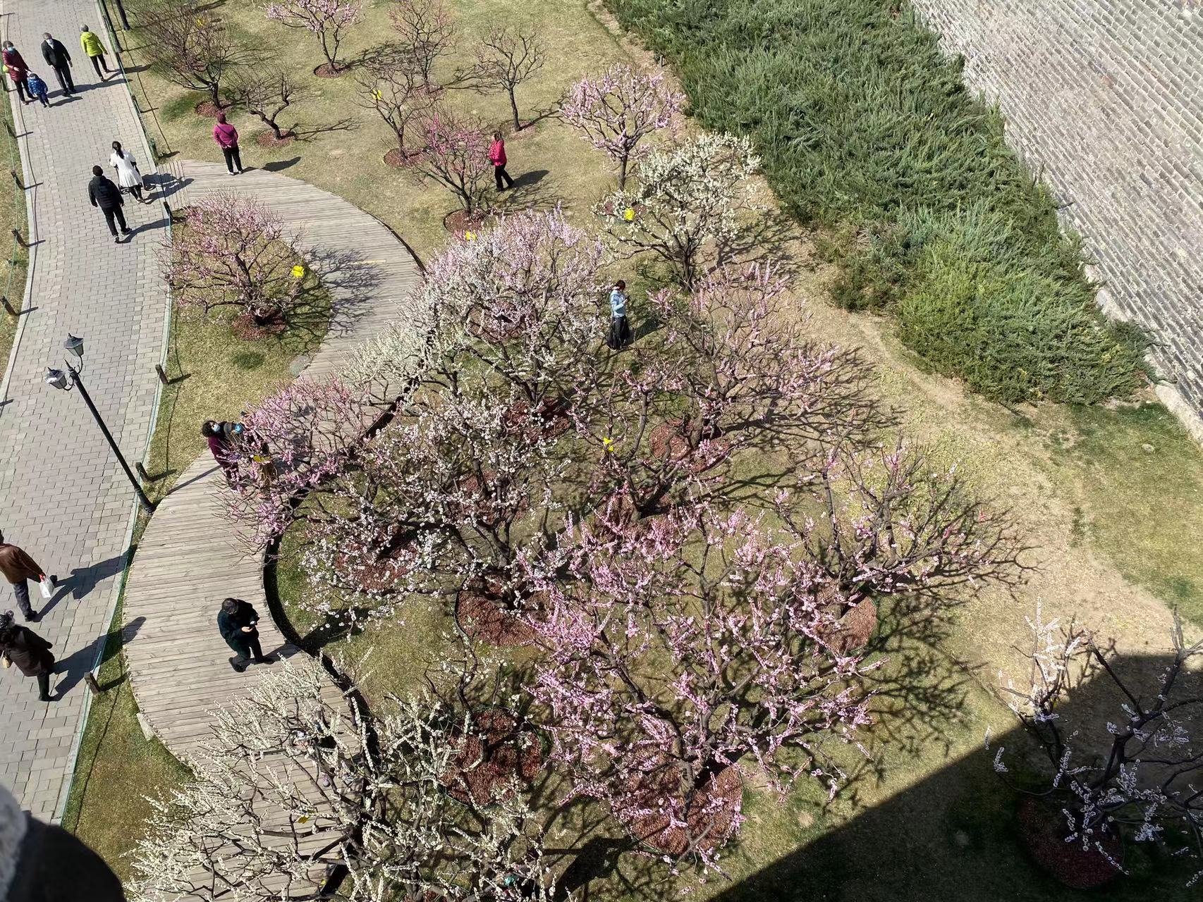 今天上午,明城墙遗址公园内梅花、山桃花、玉兰等绽放,一株株垂柳吐绿,古城墙下成了市民春季踏青赏花热门打卡地。