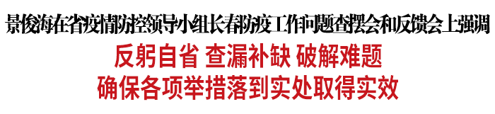 在省疫情防控领导小组长春防疫工作问题查摆会上,各有关专项工作组汇报长春防疫工作存在的问题并提出有关建议。景俊海要求各专项工作组各尽其职、各负其责,密切配合、加强协作,进一步加大督促检查和支持服务力度,指导长春市把各项工作落实落细落到每一个环节。