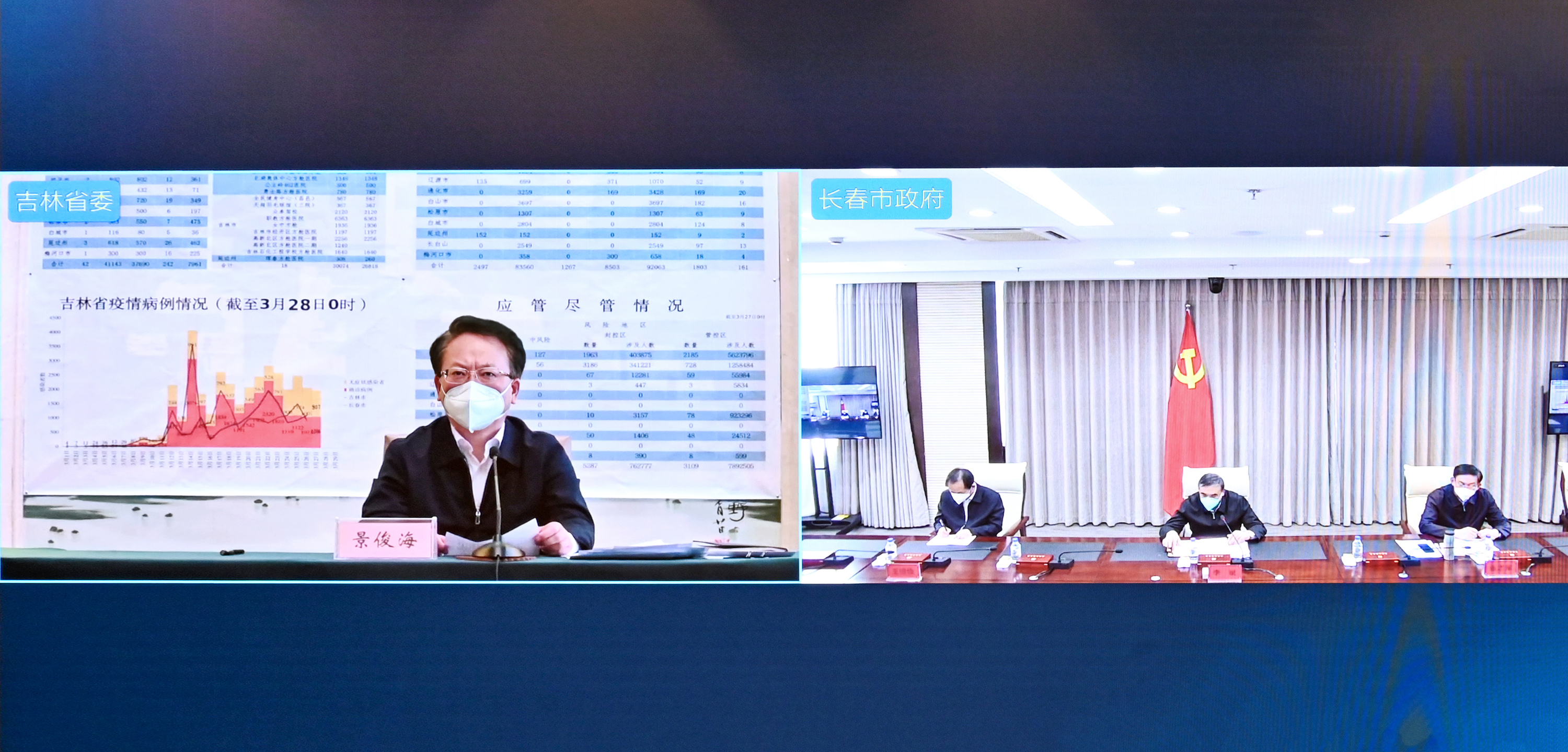 3月28日,省委书记景俊海以视频形式主持召开省疫情防控领导小组长春防疫工作问题查摆会和反馈会。