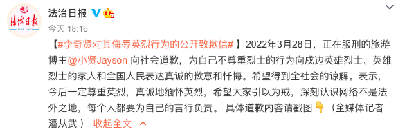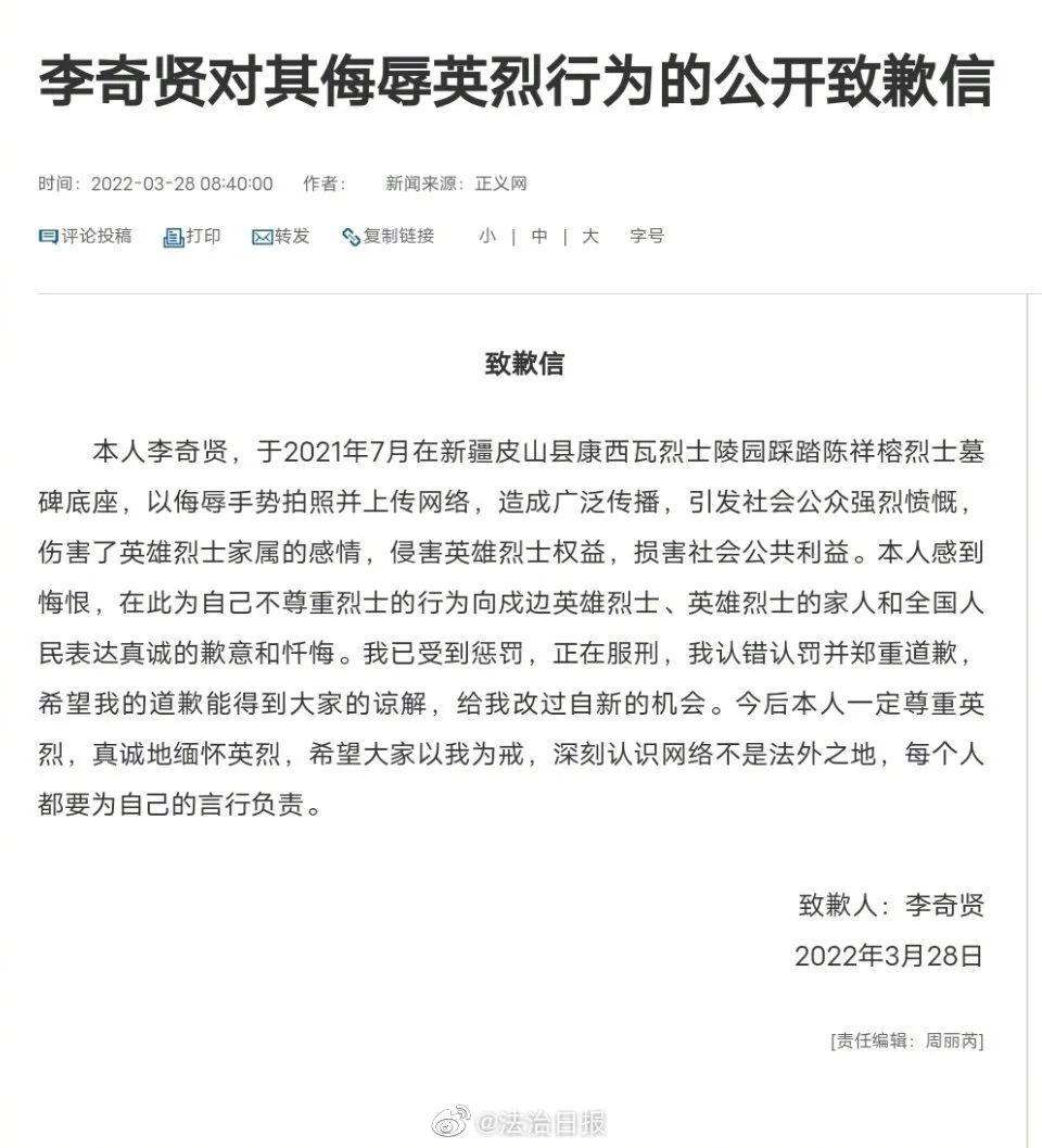 据@法治日报 报道,2022年3月28日,正在服刑的旅游博主李奇贤向社会道歉,为自己不尊重烈士的行为向戍边英雄烈士、英雄烈士的家人和全国人民表达真诚的歉意和忏悔,希望得到全社会的谅解。他表示,今后一定尊重英烈,真诚地缅怀英烈,希望大家引以为戒,深刻认识网络不是法外之地,每个人都要为自己的言行负责。