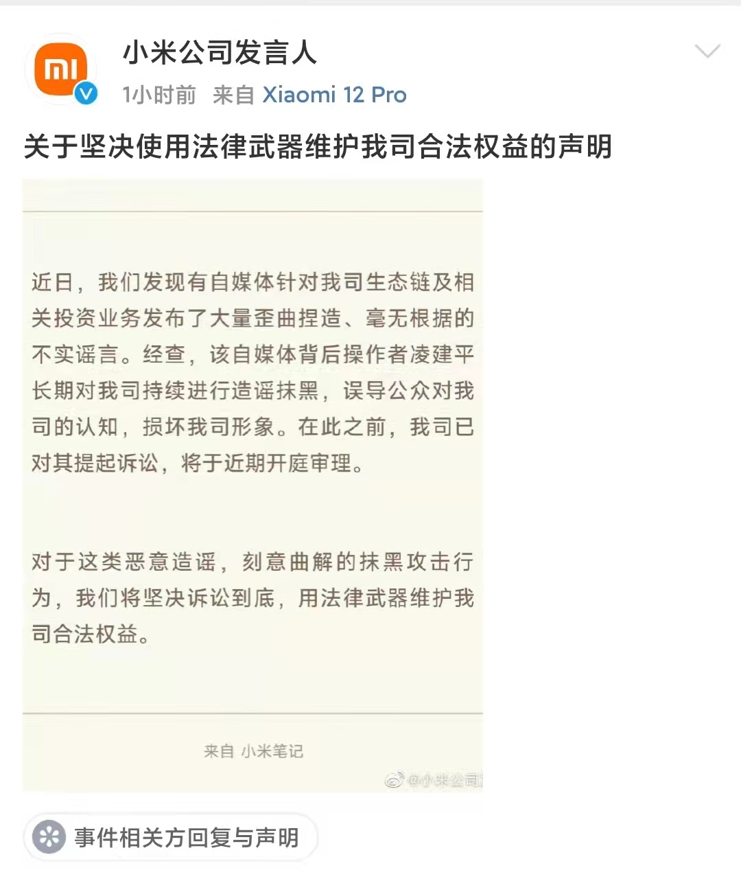 小米方面表示,经查,该自媒体背后操作者凌建平长期对小米持续进行造谣抹黑,误导公众对小米的认知,损坏小米形象。在此之前,小米已对其提起诉讼,将于近期开庭审理。对于这类恶意造谣,刻意曲解的抹黑攻击行为,小米将坚决诉讼到底,用法律武器维护合法权益。