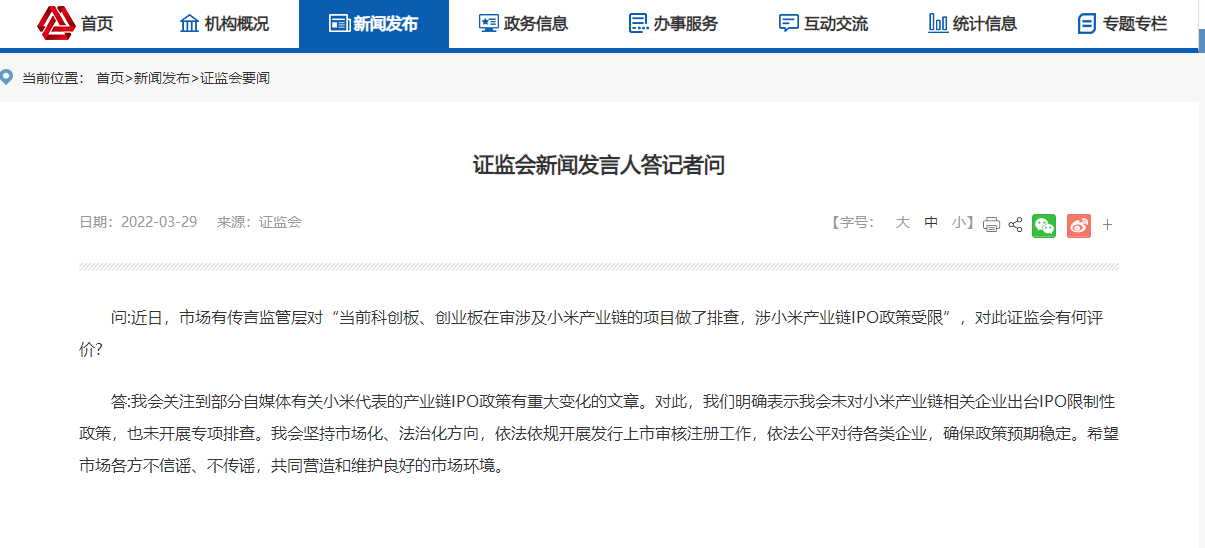 近日,市场有传言监管层对“当前科创板、创业板在审涉及小米产业链的项目做了排查,涉小米产业链IPO政策受限”。3月29日,证监会新闻发言人表示,未对小米产业链相关企业出台IPO限制性政策,也未开展专项排查。