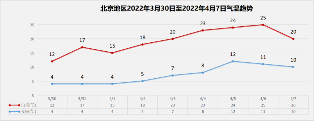 4月2日至4月6日,气温回升,白天最高气温18~25℃,夜间最低气温5~12℃,建议市民根据天气情况适时增减衣物。