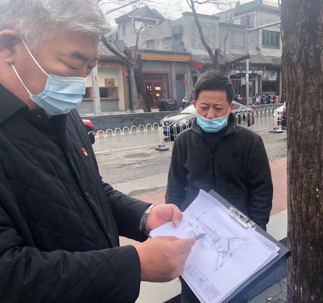 今天上午,一场小雨过后,地安门外大街最北端的坑洼路面出现了少量积水。北京什刹海阜景街建设指挥部、属地街道等相关各方工作人员共同到现场制定了临时性的路面修补计划。根据市民提出的建议及施工图纸进行现场比对,很快确定了方案。临时性修补具有可行性,铣刨破损的表层路面再进行铺油,市民反映的问题可以快速解决。