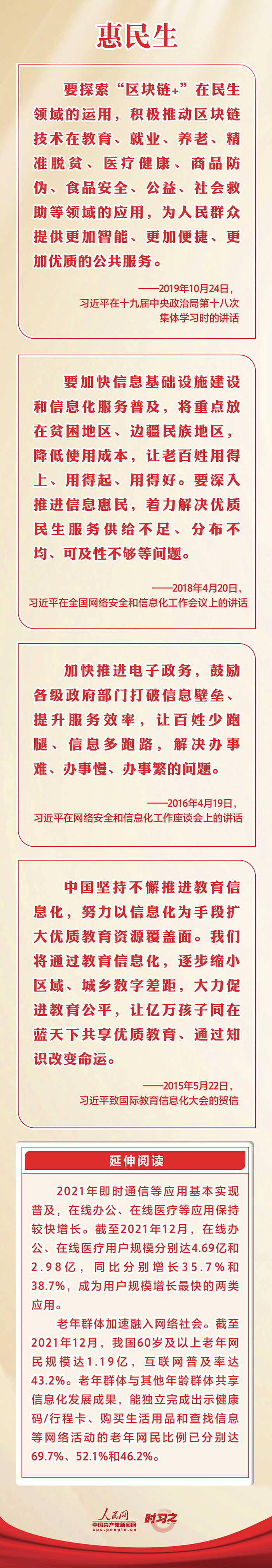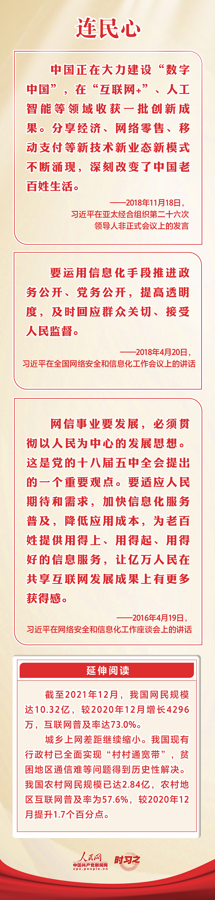 “网信事业要发展,必须贯彻以人民为中心的发展思想。”党的十八大以来,习近平总书记多次就网信事业发展作出重要论述。网络惠民、人民为本,如何让亿万人民共享互联网发展成果,人民二字是总书记一以贯之的牵挂。