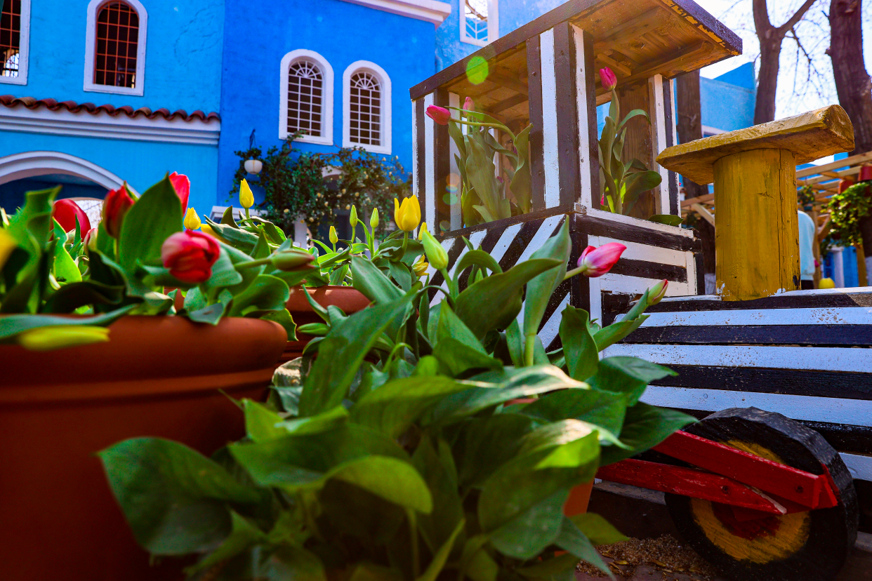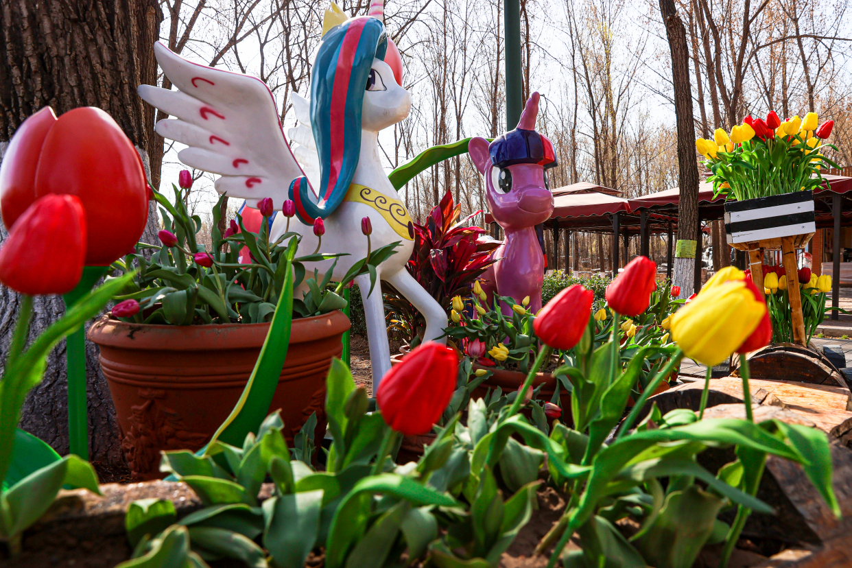 据了解,北京野生动物园引进了数万株高品质郁金香,一朵朵黄如金、红似火、紫若兰……让人目不暇接。园区设置了8个以郁金香为主题的打卡点位,主场地蓝色小镇别具特色的建筑风格与烂漫的郁金香花相呼应,散发出神秘气质与优雅情调,充满了浪漫的异域风情。